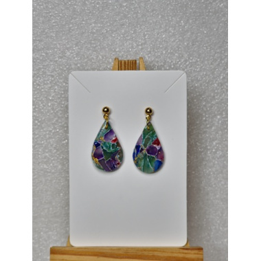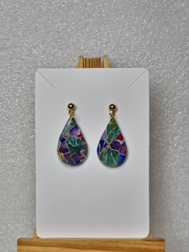 The earrings feature a vibrant, abstract marbled pattern with dominant hues of red, green, and gold. These are fitted with stainless steel, gold tone, hypoallergenic, tarnish resistant post.