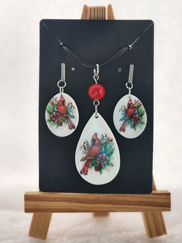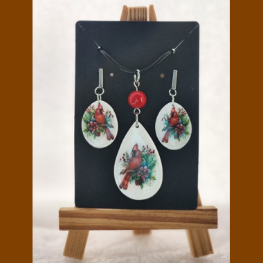 Handcrafted 20" Corded Necklace, Pendant, Cardinal pictured resting on a holly branch measuring 1-1/2"x1" adorned with a red bead. Matching stainless steel post earrings.