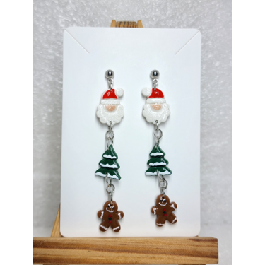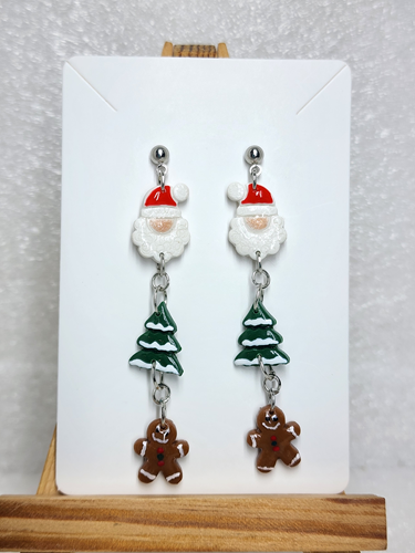 Celebrate the season with these whimsical handmade polymer clay dangle earrings, featuring a festive trio of holiday icons. Each pair showcases a jolly Santa, a delicate snow-dusted evergreen, and a cheerful gingerbread man—meticulously crafted to capture the warmth and nostalgia of Christmas. Lightweight and comfortable for all-day wear, these artisanal earrings bring playful holiday spirit to any outfit. Perfect as a gift for seasonal enthusiasts or a personal treat that spreads joy throughout the festive months.