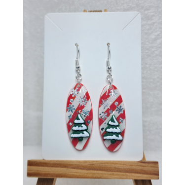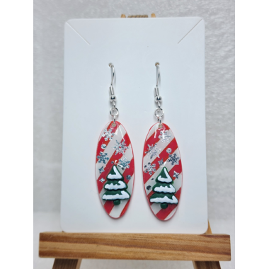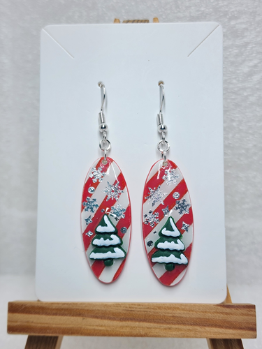 Bring festive cheer to your holiday wardrobe with these delightful handcrafted polymer clay earrings! Each earring features a charming snow-dusted Christmas tree set against a classic red and white candy cane striped background, complete with sparkling silver glitter snowflake accents that catch the light beautifully.